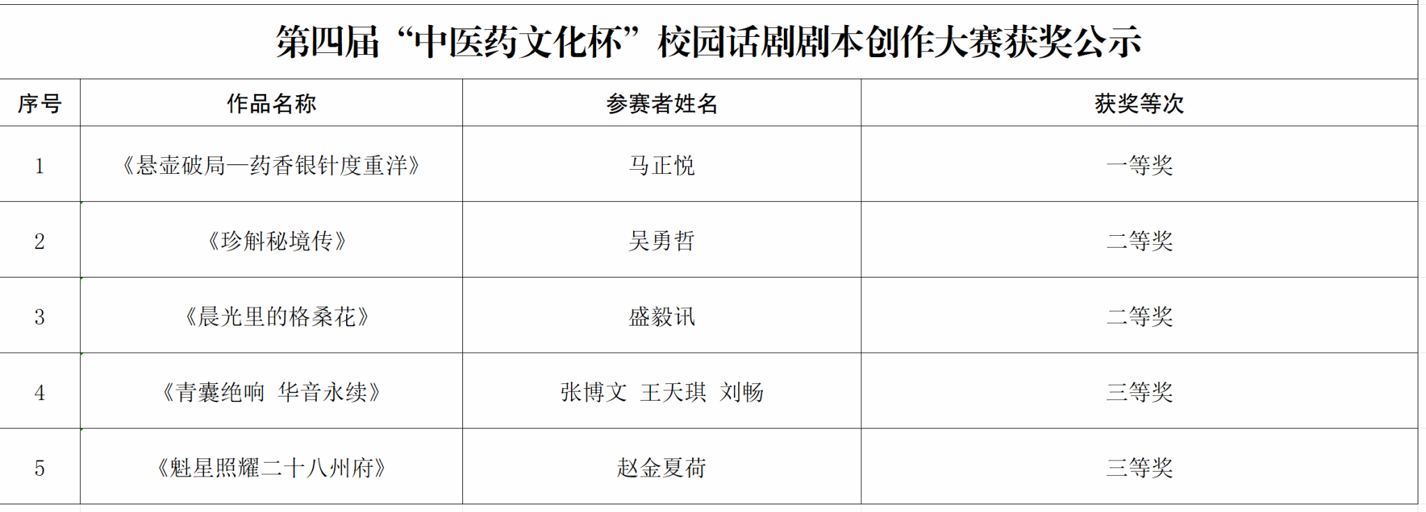 为弘扬中医药特色文化,坚定文化自信,展现学子风采,由校团委、语委办、人文与国际教育交流学院联合主办,大学生杏林话剧社与大学生话剧俱乐部共同承办的第四届“中医药文化杯”校园话剧剧本创作大赛已完成评审,现将获奖名单予以公示(见附件),公示期自2025年6月5日起至6月10日止。公示期间如有异议,请与校语委办联系,QQ:729134486。